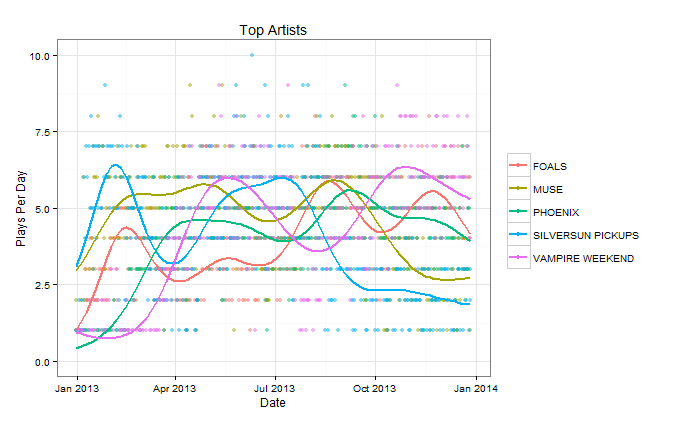 labs(x="Date",y="Plays Per Day",title="Top Artists",colour=NULL)+
