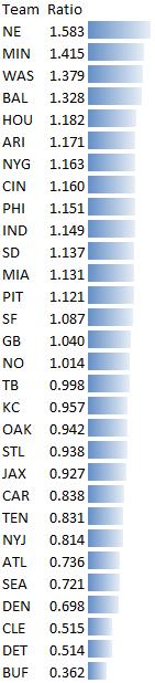 NE (53%), BAL (20%), WAS (8%), and MIN (7%) are the most common teams picked in the Yahoo! leagues. They are also the top four teams according to my metric in a different order.