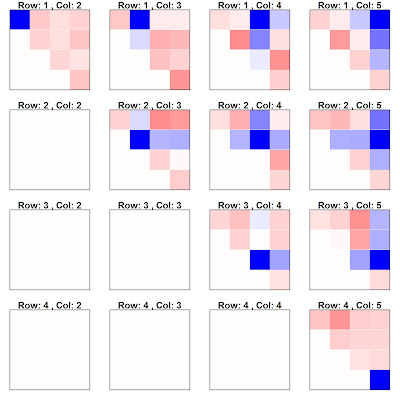 The above example is just random data, so all correlations are spurious. Blue is positive, red is negative, and white is no correlation. You can see in the row 1, column 1 matrix that the 1st row and 1st column is dark blue. This is because this is the correlation with itself. Similarly in all other rows and columns.