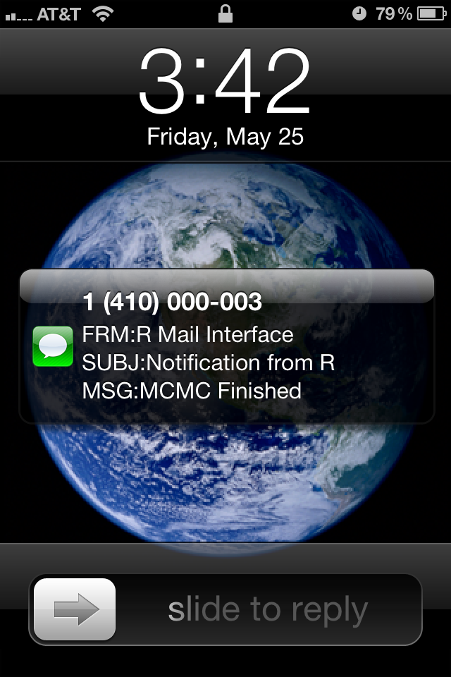 I got the idea from here. He uses a Python script and the text interface is not free. I thought someone must have already thought of this for R. There is an easy solution. You can send an email fairly easily in R. You can also send text messages as emails. This page gives a few examples of how to send an email in R. Sending a text via email will depend on what carrier you have and I am sure standard text message fees apply.You can only send 20 emails a day with this package, but that probably won't be a big deal.