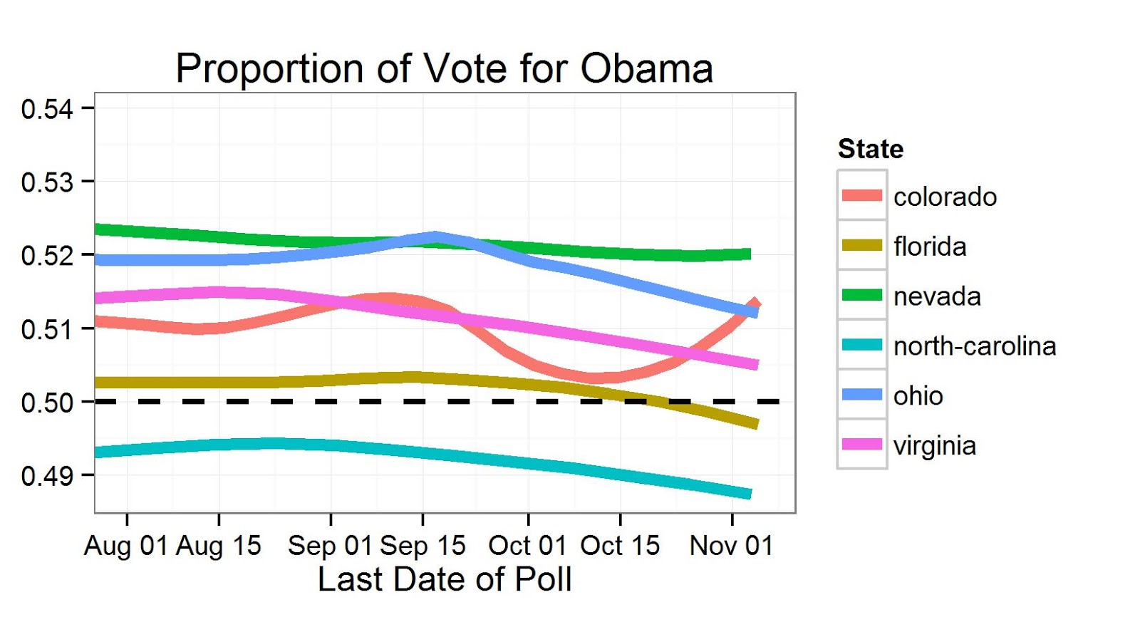 By just looking at the tracking polls, I think you would make the same conclusions that Nate Silver has with his fancy model. Ohio, Virginia, Nevada, and Colorado favor Obama. North Carolina favors Romney and Florida just barely tips toward Romney as well.
