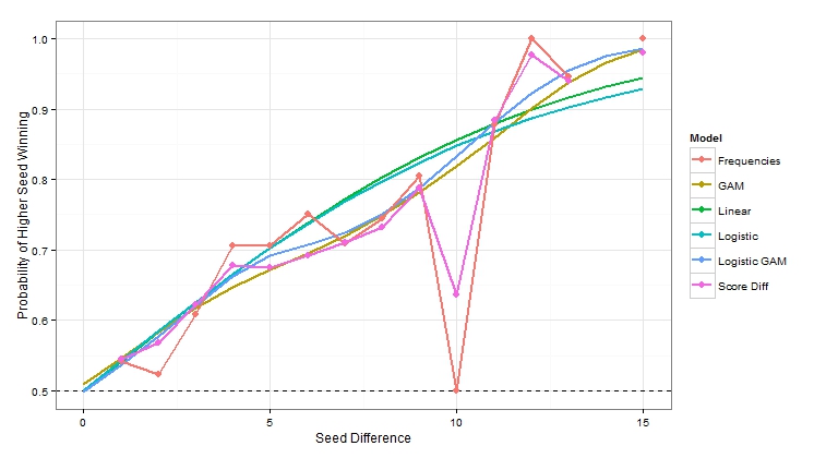 Putting all of the estimates together, you can easily spot the differences between the models. The two assumptions that just used the data between specific seeds look pretty similar. It looks like using score differential is a little more reasonable of the two. The two GAMs have a similar trend and so did the linear and logistic models. If someone asks you what the probability that a 16 seed beats a 1 seed, you have at least 6 different answers.This post highlights the many different ways someone can analyze the same data. Simply statistics talked a bit about this in a recent podcast. In this case, the differences are not huge, but there are noticeable changes. So the next time you read about an analysis that someone did, keep in mind all the decisions that they had to make and what type a sensitivity they would have on the results.