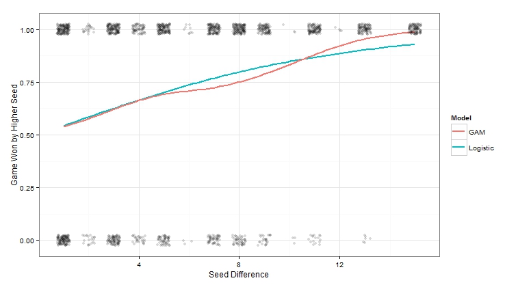 In the plot below, you can see that the logistic model predicts that the probability of winning increases throughout until reaching about 90% for the 16 versus 1. I also included a non-linear generalized additive model (GAM) model for comparison. The GAM believes that being a big favorite (16 vs 1 or 15 vs 2) gives an little boost in win probability. An advantage of modeling is that we can make predictions for match-ups that have never occurred (like a seed difference of 14).
